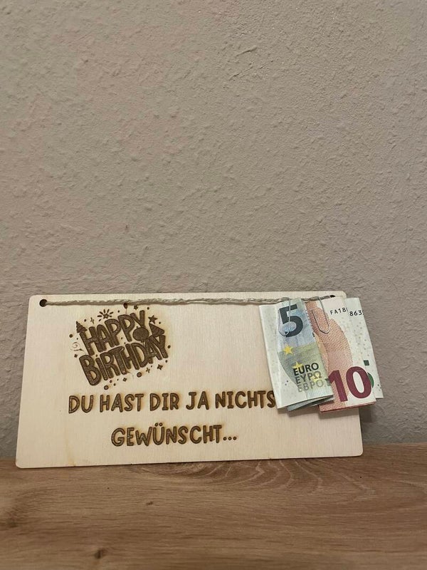 Unser handgefertigtes Geldgeschenk aus Holz verwandelt eine einfache Geldgabe in ein liebevolles, persönliches Highlight. Ideal für Hochzeiten, Geburtstage, Taufen oder Jubiläen – mit individueller Gravur und kreativen Designs wird aus jeder Geldüberraschung ein bleibendes Erinnerungsstück.